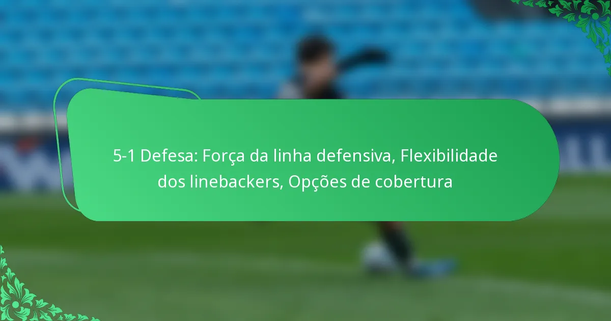 A defesa 5-1 é uma formação estratégica de futebol que enfatiza uma linha defensiva forte com cinco jogadores da linha e um linebacker. Esta configuração não só fortalece a linha contra jogadas ofensivas, mas também proporciona flexibilidade para os linebackers e opções de cobertura, tornando-a uma escolha versátil para contrariar ataques de corrida e passe. A força da linha defensiva é essencial para controlar o jogo, enquanto a adaptabilidade dos linebackers melhora a eficácia geral da defesa.