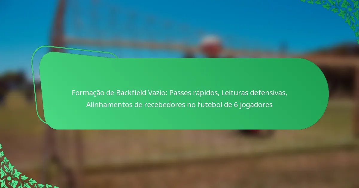 A formação de backfield vazio no futebol de 6 jogadores elimina os running backs do backfield, enfatizando uma estratégia orientada para o passe. Esta configuração permite passes rápidos que exploram desajustes defensivos, permitindo ao quarterback distribuir a bola rapidamente aos recebedores. Ao ler eficazmente os alinhamentos defensivos, as equipas podem ajustar as suas táticas para capitalizar sobre as fraquezas e aumentar a eficiência ofensiva.