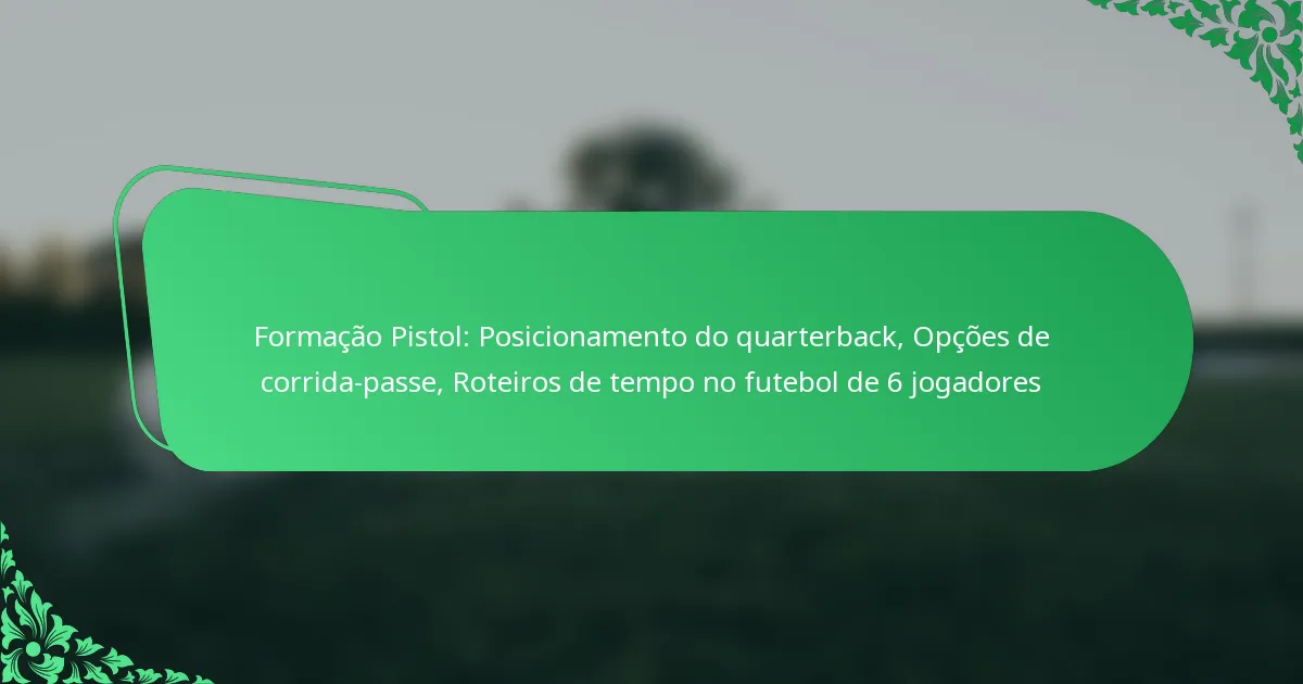 A formação Pistol no futebol de 6 jogadores é um alinhamento estratégico onde o quarterback se posiciona a alguns metros atrás do centro, permitindo tanto jogadas de corrida como de passe. Este arranjo melhora a versatilidade da ofensiva, permitindo uma tomada de decisão rápida e uma execução dinâmica das jogadas.